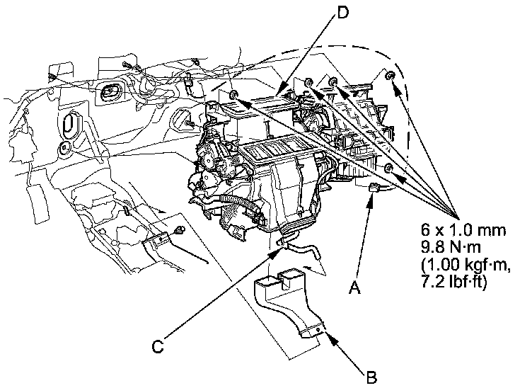 8. Disconnect the right engine compartment wire harness connector (C201) (A). Remove the duct (B), and the drain hose (C). Then remove the mounting nuts, and the blower-heater unit (D).