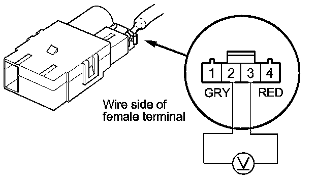 3. Turn the ignition switch to ON (II), or press the engine start/stop button to select the ON mode. Measure the voltage between the terminals with the (+) probe on terminal No. 2 and the (-) probe on terminal No. 3 with the connector connected.
