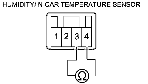 3. Compare the resistance reading between terminals No. 4 and No. 3 of the humidity/in-car temperature sensor with the specifications shown in the graph; the resistance should be within the specifications.