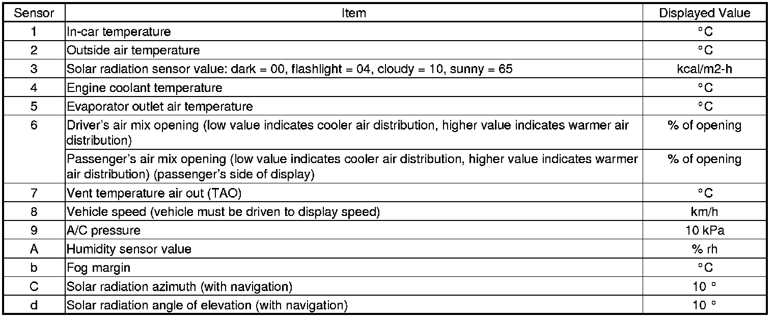The climate control unit has a mode that displays the sensor inputs it receives. This mode shows you what the climate control unit is receiving from each of the sensors, one at a time, and it can help you determine if a sensor is faulty.