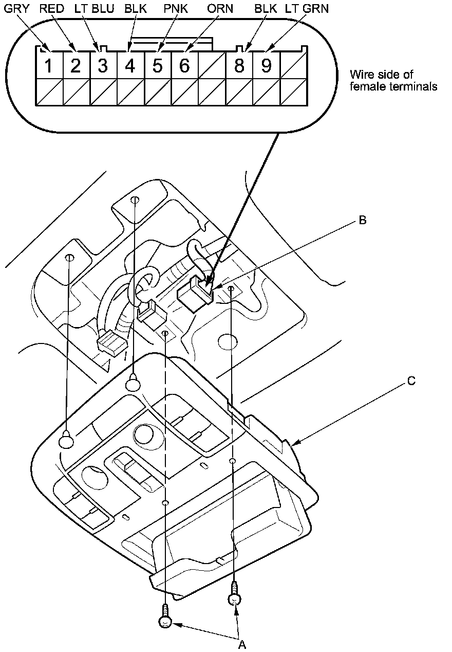 3. Disconnect the 20P connector (B) from the roof console (C).