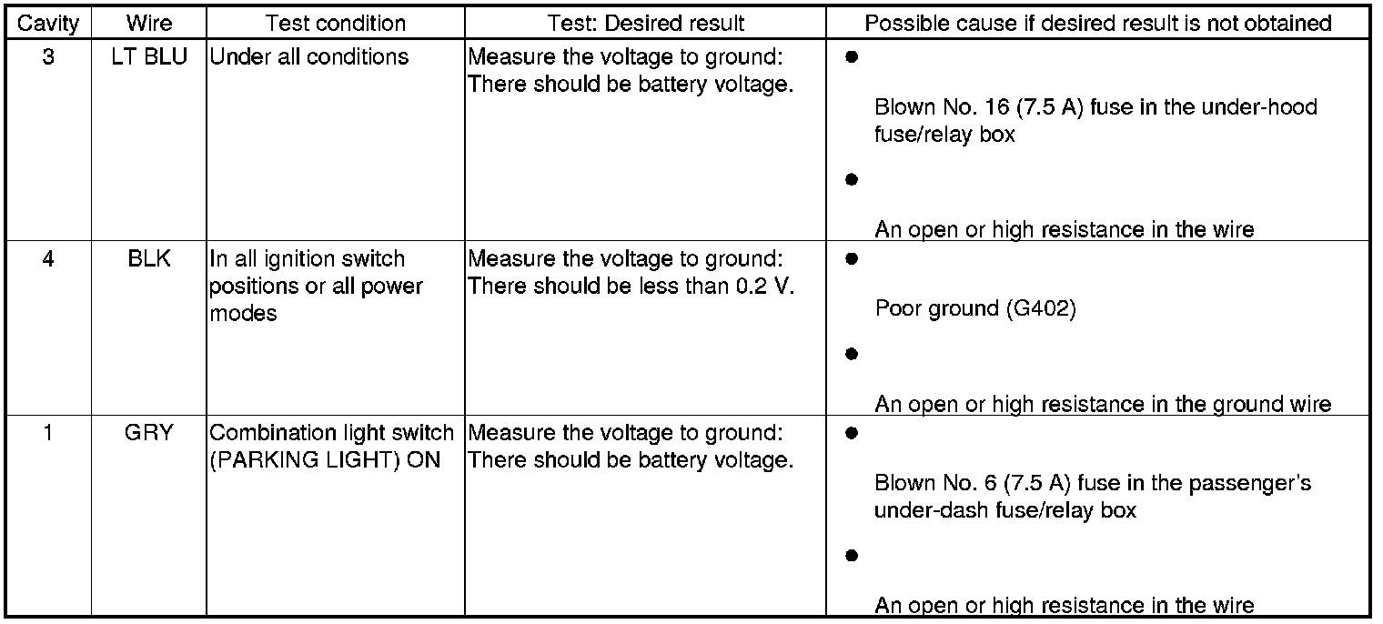 6. Reconnect the connector to the roof console, and do the following input tests: