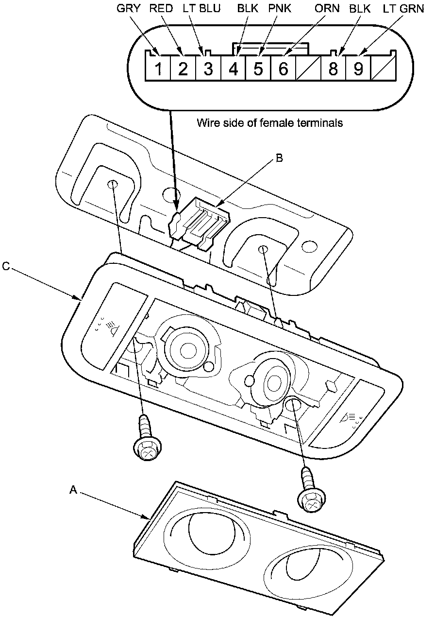 3. Disconnect the 10P connector (B) from the rear individual map light (C).