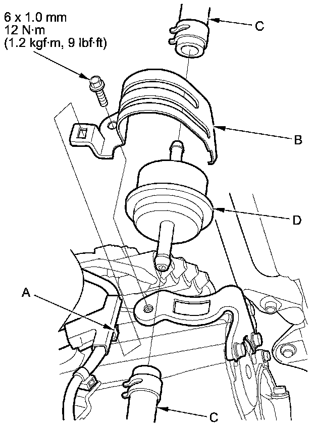 6. Disconnect the ATF cooler hoses (C) from the ATF filter (D).
