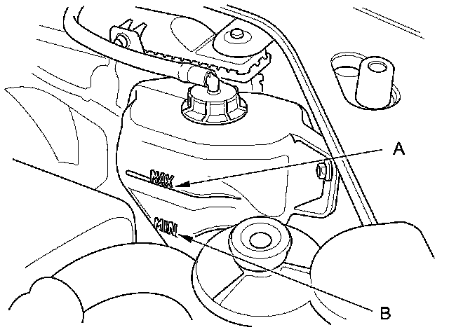 1. Check the coolant level in the coolant reservoir. Make sure it is between the MAX mark (A) and the MIN mark (B).