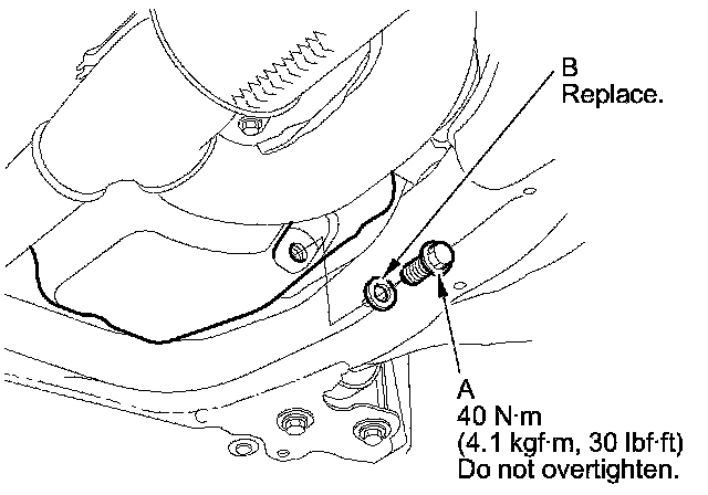 3. Reinstall the drain bolt with a new washer (B) and torque to specification.