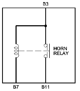 There should be battery voltage at terminal B11 when battery power is connected to terminal B3, and body ground is connected to terminal B7. There should be no voltage at terminal B11 when power is disconnected.
