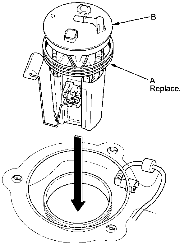 1. Temporarily attach a new base gasket (A) to the fuel tank unit (B), then insert the fuel tank unit partially into the fuel tank.