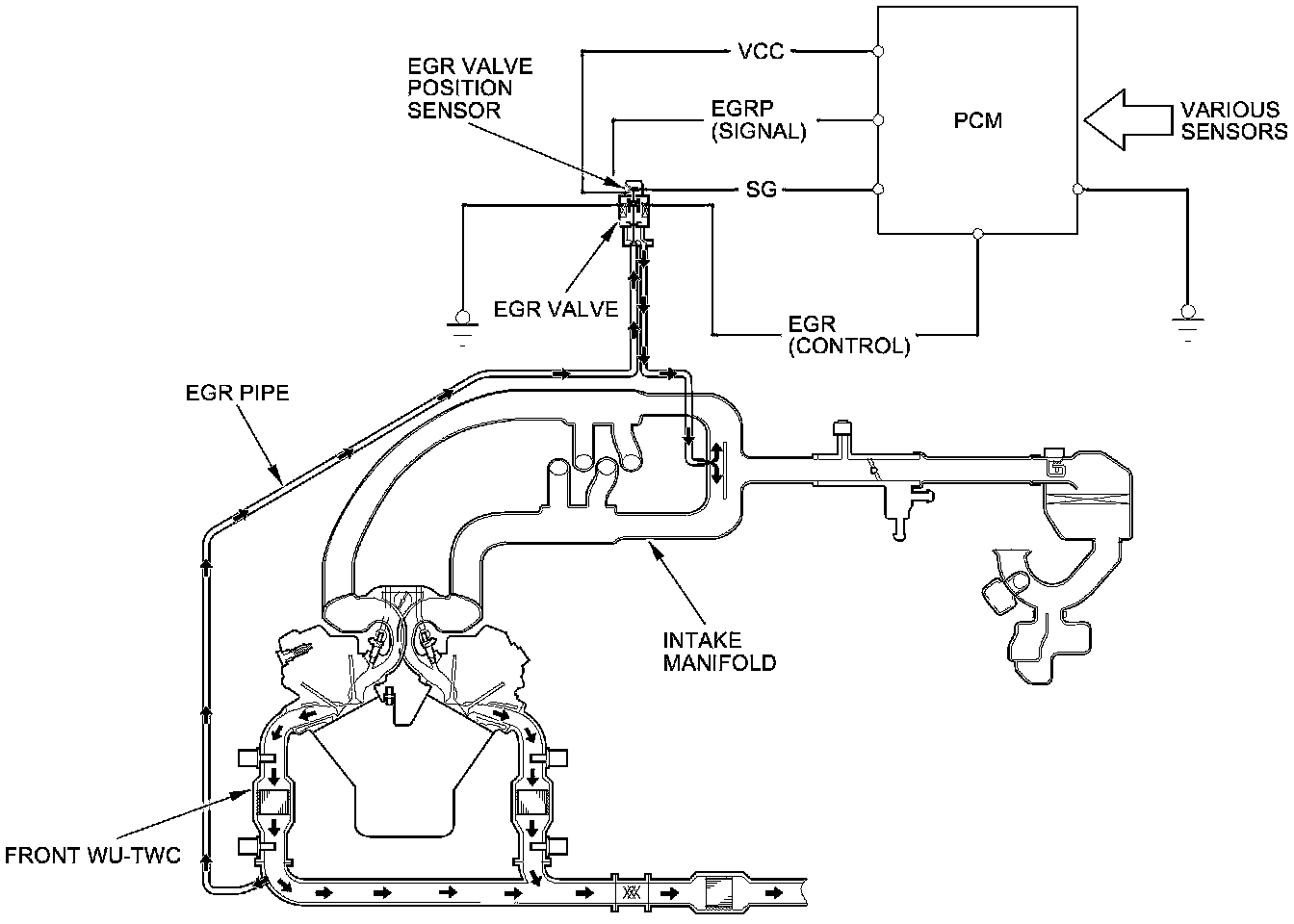 The EGR system reduces oxides of nitrogen (NOx) emissions by recirculating exhaust gas through the EGR pipe to the intake manifold, and into the combustion chambers. Routing the exhaust gas through the EGR pipe after the front WU-TWC helps to prevent carbon deposits from forming in the intake manifold and the throttle body. The PCM memory contains the ideal EGR valve position for varying operating conditions.
