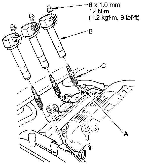 3. Remove the spark plugs (C) and inspect them Testing and Inspection.