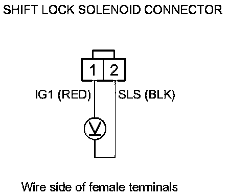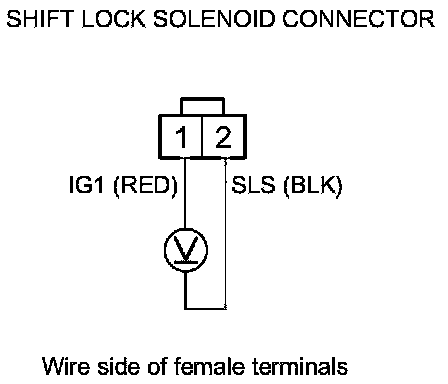11. Release the brake pedal, and measure the voltage between shift lock solenoid connector terminals No. 1 and No. 2. The shift lever must be in P.