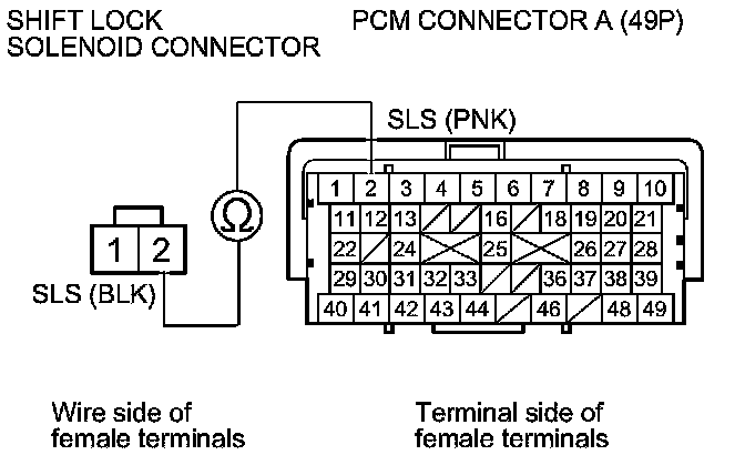 15. Check for continuity between PCM connector terminal A2 and shift lock solenoid connector terminal No. 2.