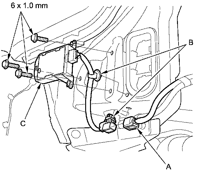 6. Connect the 6P connector (B) and attach the harness clips (C).