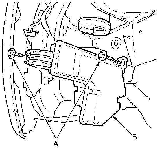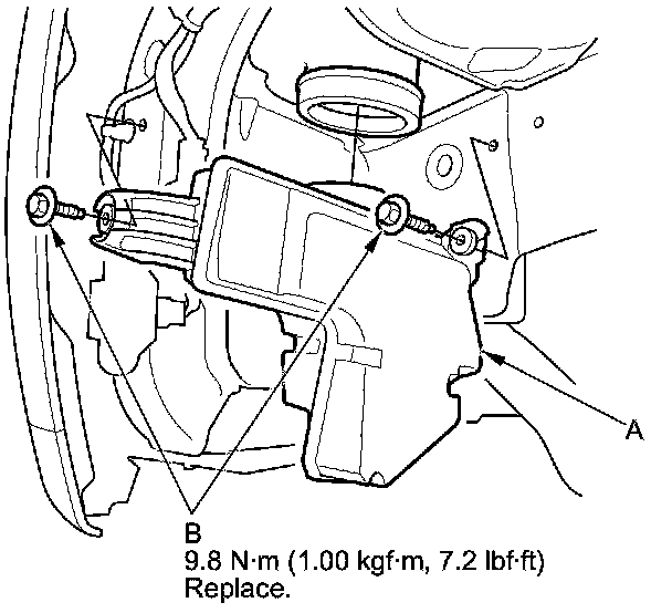 2. Left side; install the intake air resonator (A) with the mounting bolts (B).