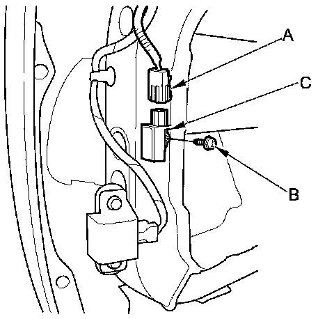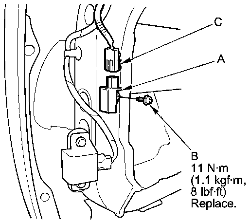 1. Install the front impact sensor (A) with the new TORX bolt (B) using a TORX T30 bit. Connect the left or right front impact sensor 2P connector (C) on the left or right engine compartment wire harness.