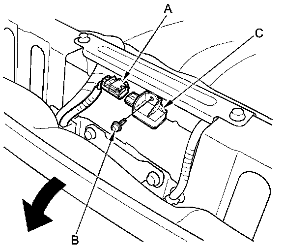 4. Remove the TORX bolt (B) using a TORX T30 bit, then remove the rear safing sensor (C).