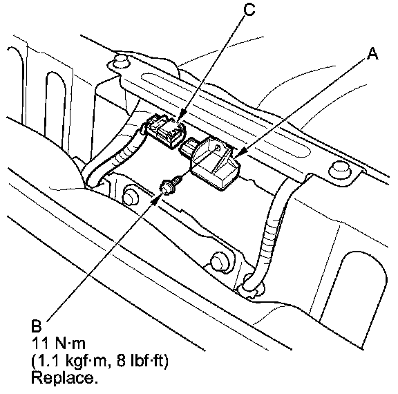 1. Install the rear safing sensor (A) with the new TORX bolt (B) using a TORX T30 bit. Connect the rear safing sensor 2P connector (C) on the floor wire harness.