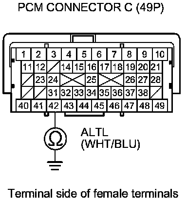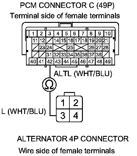 25. Check for continuity between PCM connector terminal C42 and alternator 4P connector terminal No. 3.