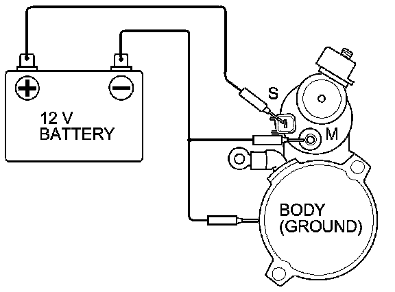 5. Connect the battery as shown. Make sure you disconnect the starter motor wire from the M terminal. If the starter pinion moves out, it is working properly.