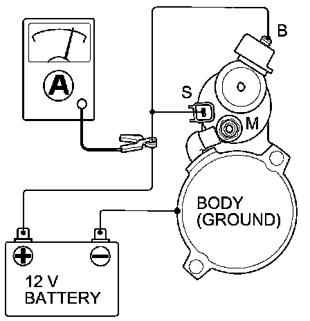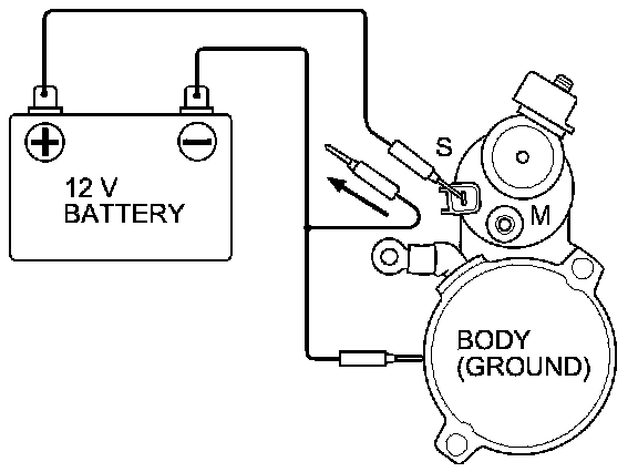 6. Disconnect the battery from the M terminal. If the pinion does not retract, the hold-in coil of the solenoid is working properly.