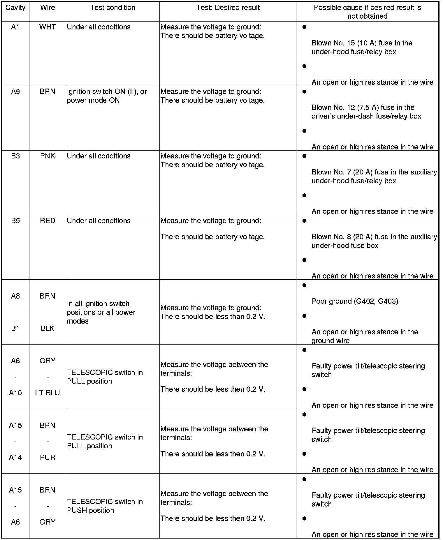 5. Reconnect the connector to the power tilt/telescopic steering control unit, and do the following input tests: