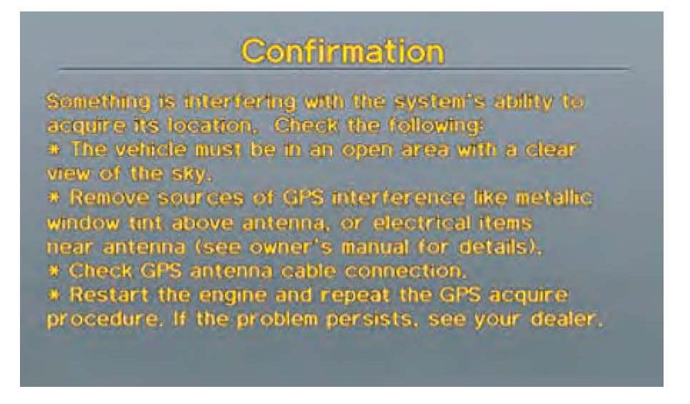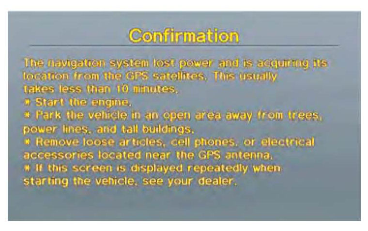 5. If the system does not initialize within 10 minutes, a second screen (shown) appears. The system is still initializing but will not automatically exit to the globe screen when the initialization is complete. Do not immediately follow the instructions on the screen. After 30 minutes, try restarting the engine to see if the navigation system completed the initialization. If it did not, follow the instructions on the screen.