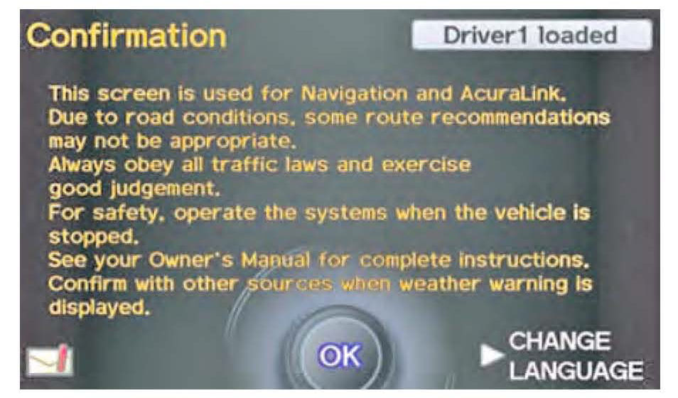 2. On the navigation system disclaimer screen, select OK by pressing the interface dial. (The interface dial is used to control several functions, including AcuraLink.)