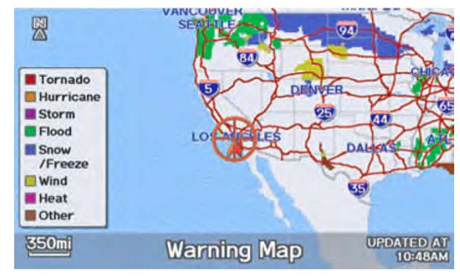 You can also see weather warnings and a weather radar image map. To see weather warnings, say or select Warning Map. The display changes to show weather warnings for the selected area.