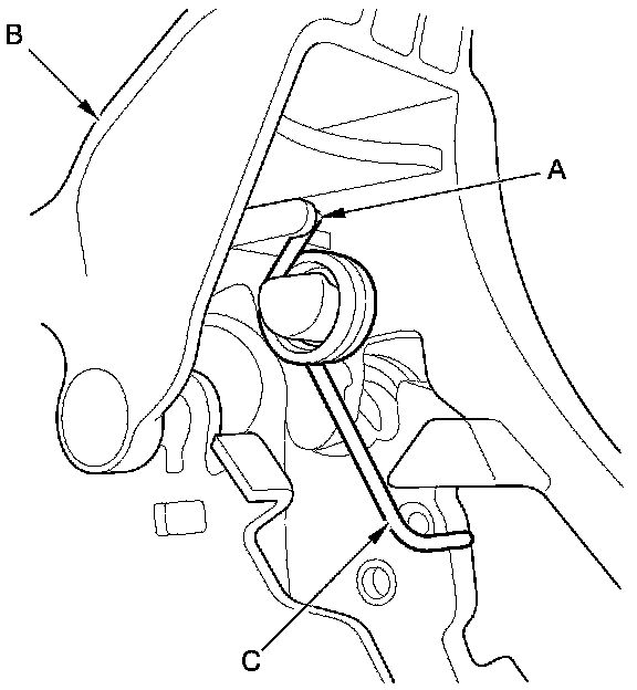 7. Make sure that the release spring end (A) is installed in the shift lock release (B), and the hooked end (C) of the release spring is on the shift lever bracket as shown.