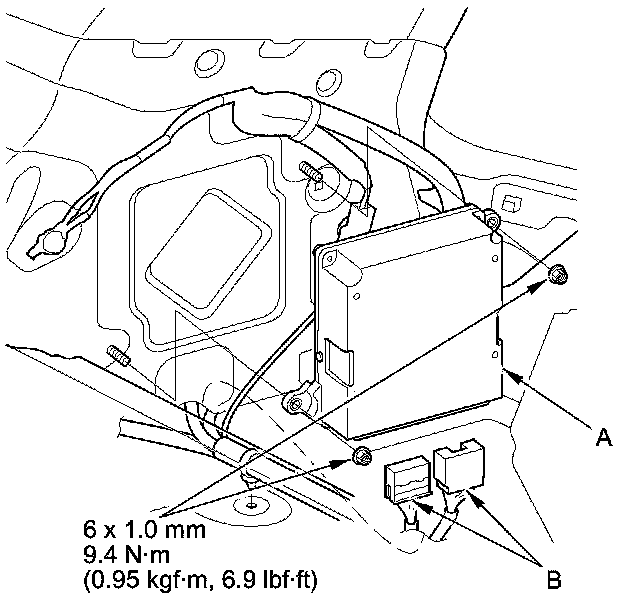 3. Disconnect the SH-AWD control unit connectors (B).