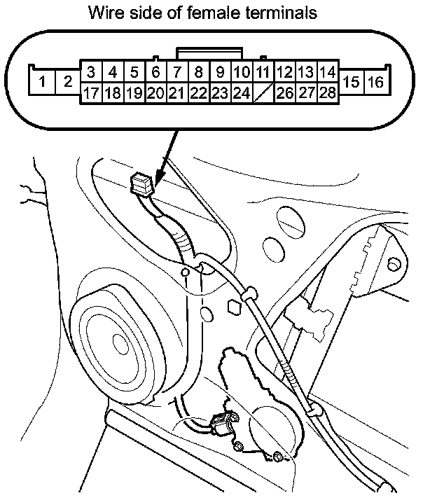 2. At the front passenger's door wire harness 28P connector, test the front passenger's power window motor in each direction by connecting battery power and ground according to the table. When the motor stops running, disconnect one lead immediately.
