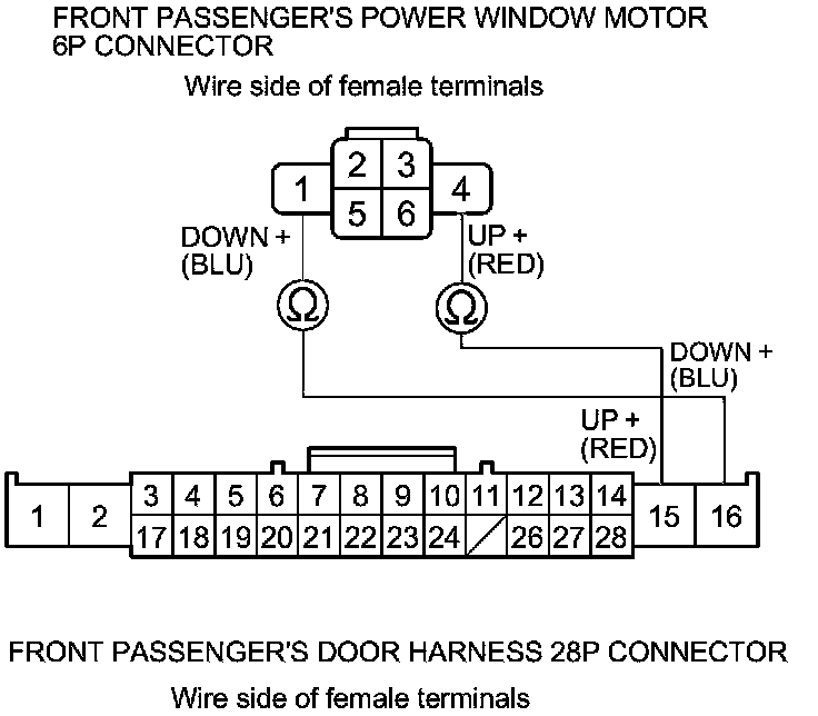 5. Check for continuity between front passenger's door harness 28P connector terminals No. 15 and No. 16, and front passenger's power window motor 6P connector terminals No. 4 and No. 1 respectively. There should be continuity.