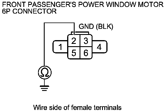 7. Check for continuity between front passenger's power window motor 6P connector terminal No. 2 and body ground. There should be continuity.