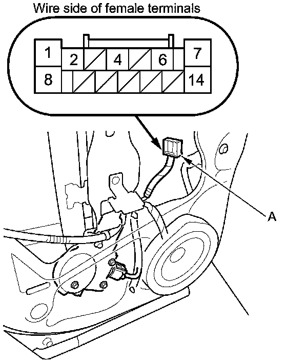 2. Test the rear power window motor in each direction by connecting battery power and ground to the rear power window switch 14P connector (A) according to the table.