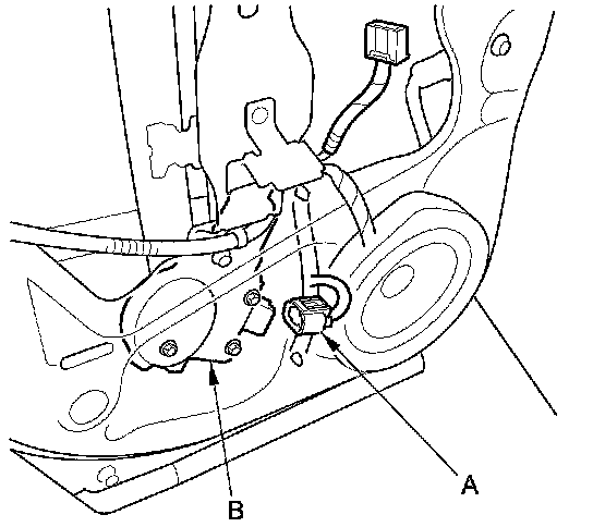 4. Disconnect the 2P connector (A) from the rear power window motor (B).