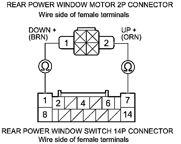 5. Check for continuity between rear power window switch 14P connector terminals No. 1 and No. 7, and rear power window motor 2P connector terminals No. 1 and No. 2 respectively. There should be continuity.