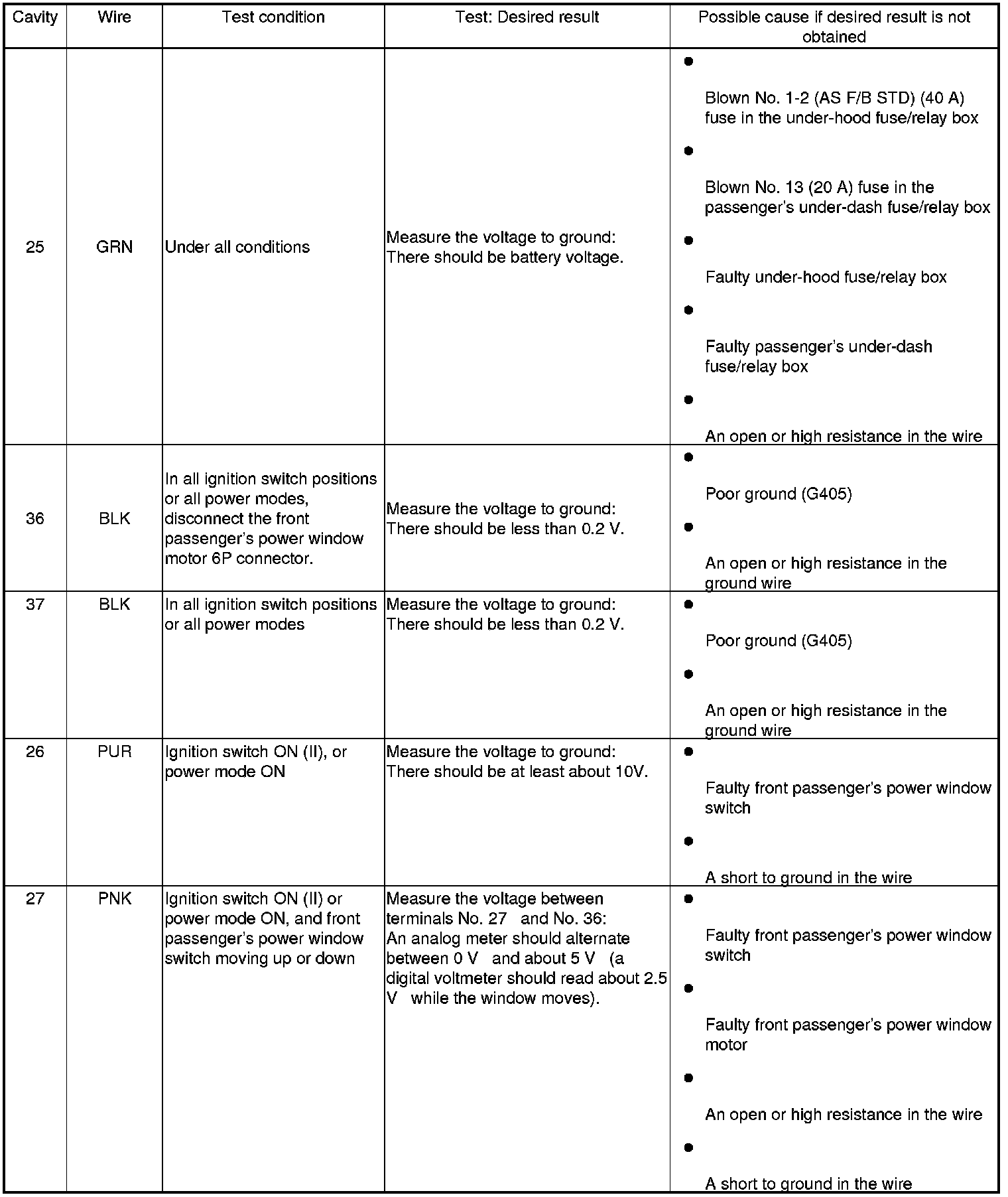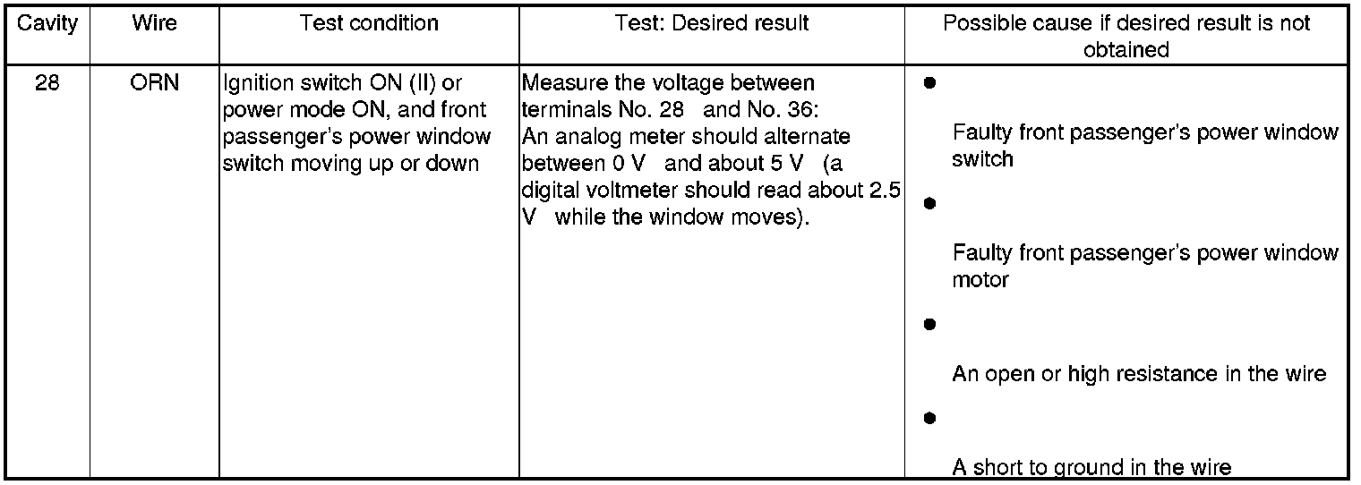 6. Reconnect the front passenger's power window switch connector to the front passenger's power window switch, and do the following input tests: