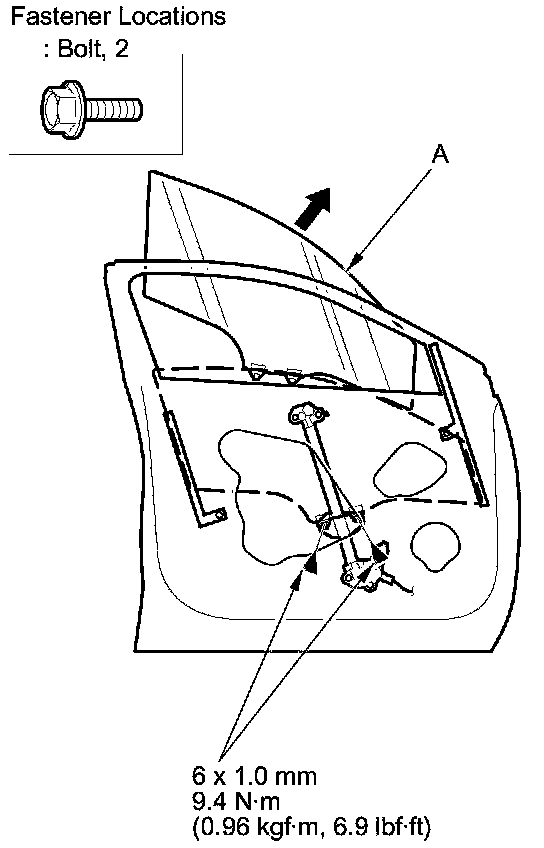 4. Lower the glass (A) until you can see the bolts, then remove them. Carefully pull out the glass through the window slot.