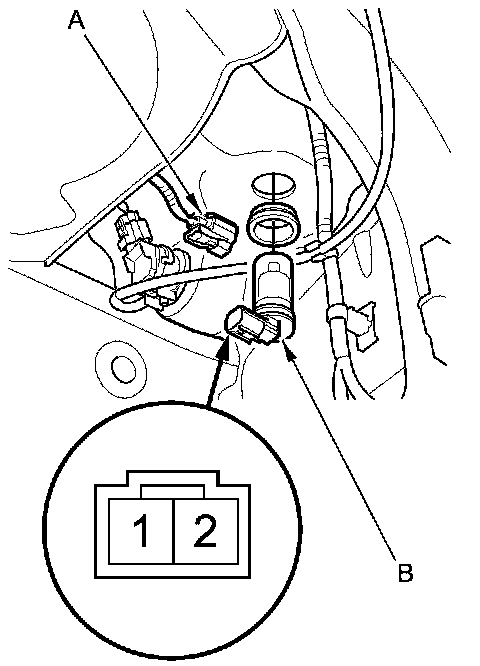 2. Disconnect the 2P connector (A) from the washer fluid level switch (B).