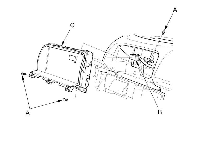 2. Remove the screws (A), then disconnect the connector (B) from the navigation display unit (C).