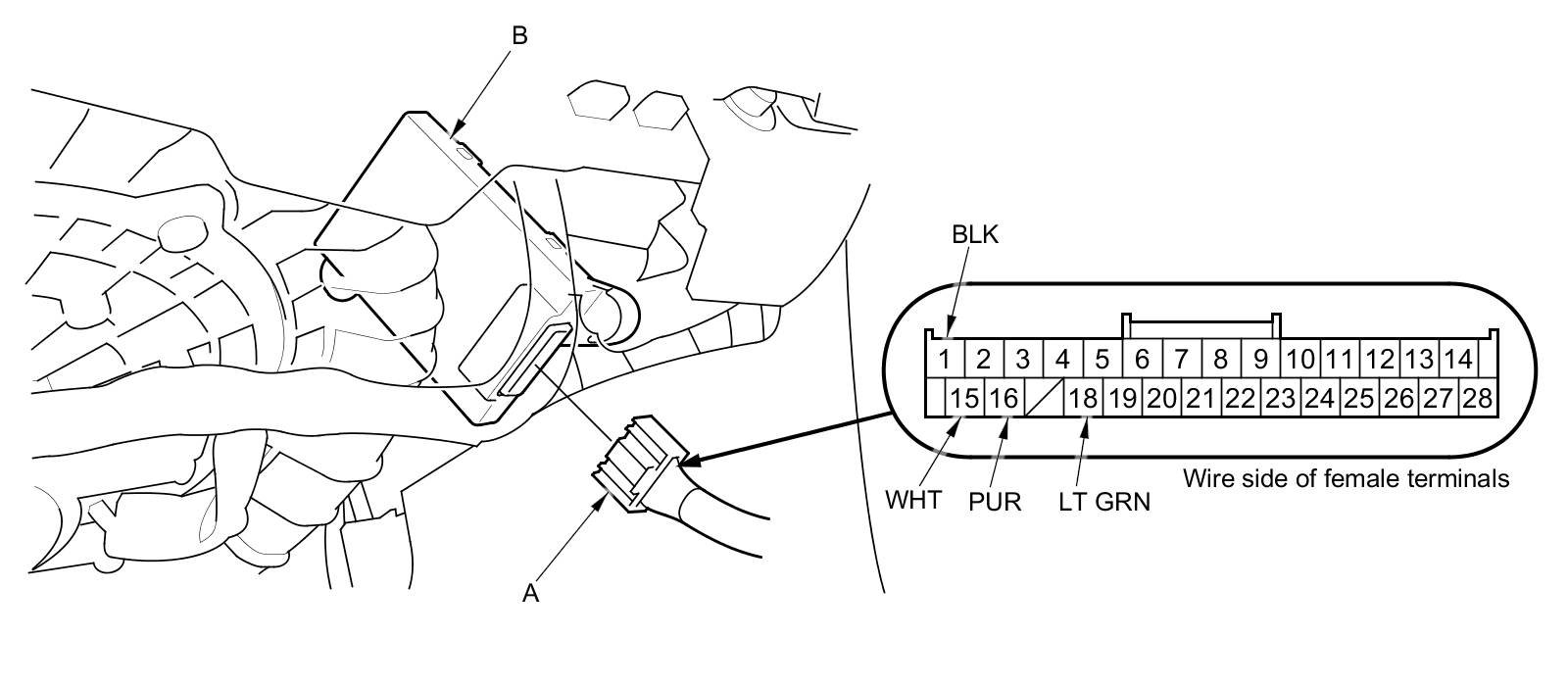 2. Disconnect the 28P connector (A) from the HandsFreeLink control unit (B).