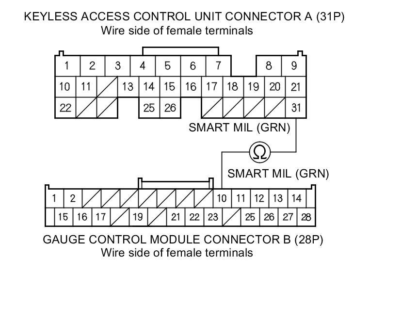 11. Check for continuity between keyless access control unit connector A (31P) terminal No. 31 and gauge control module connector B (28P) terminal No. 10.