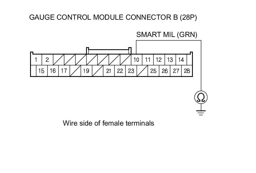 13. Connect an ohmmeter between gauge control module connector B (28P) terminal No. 10 and body ground.