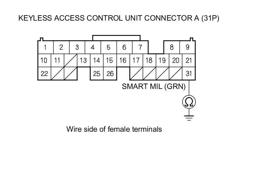 23. Check for continuity between keyless access control unit connector A (31P) terminal No. 31 and body ground.
