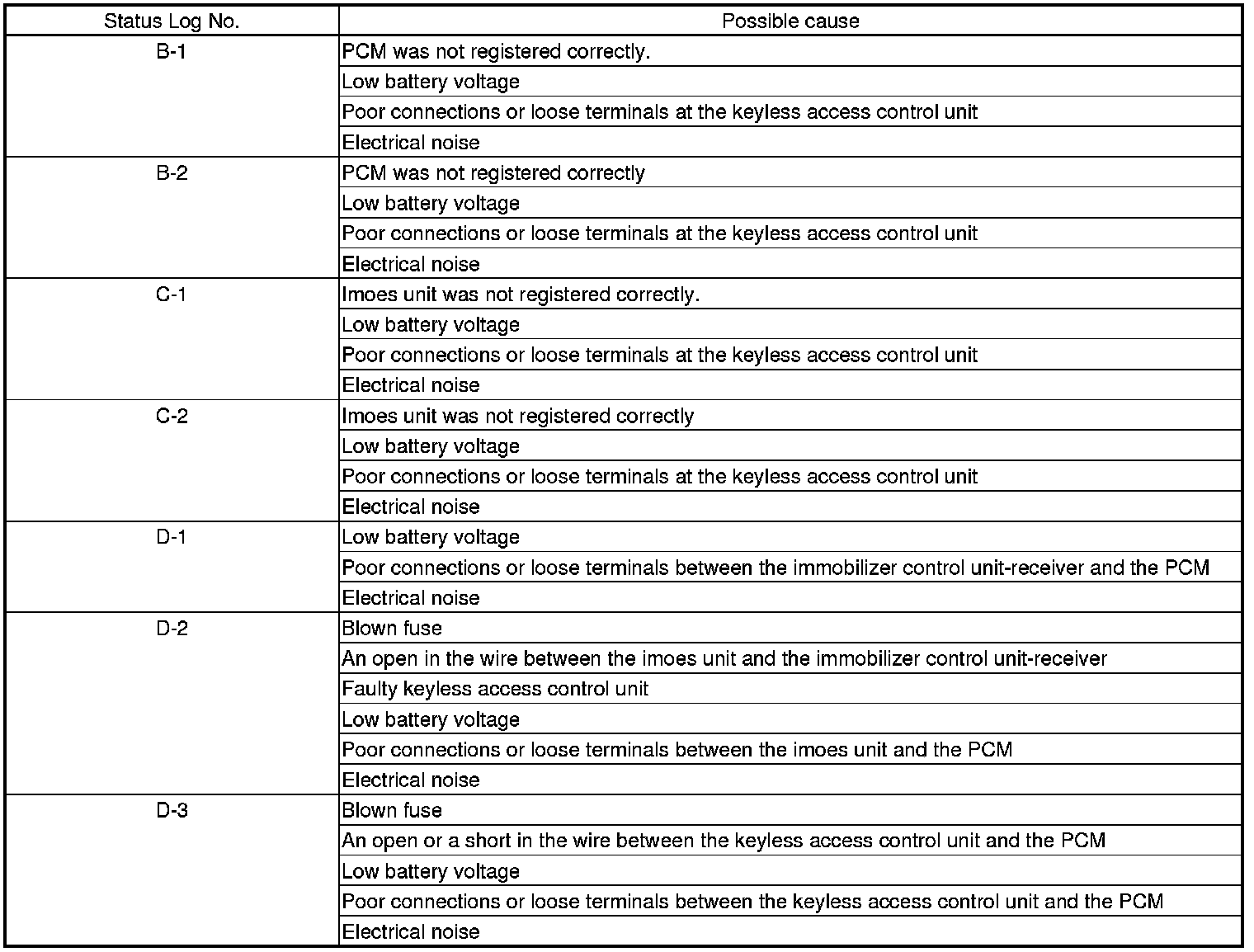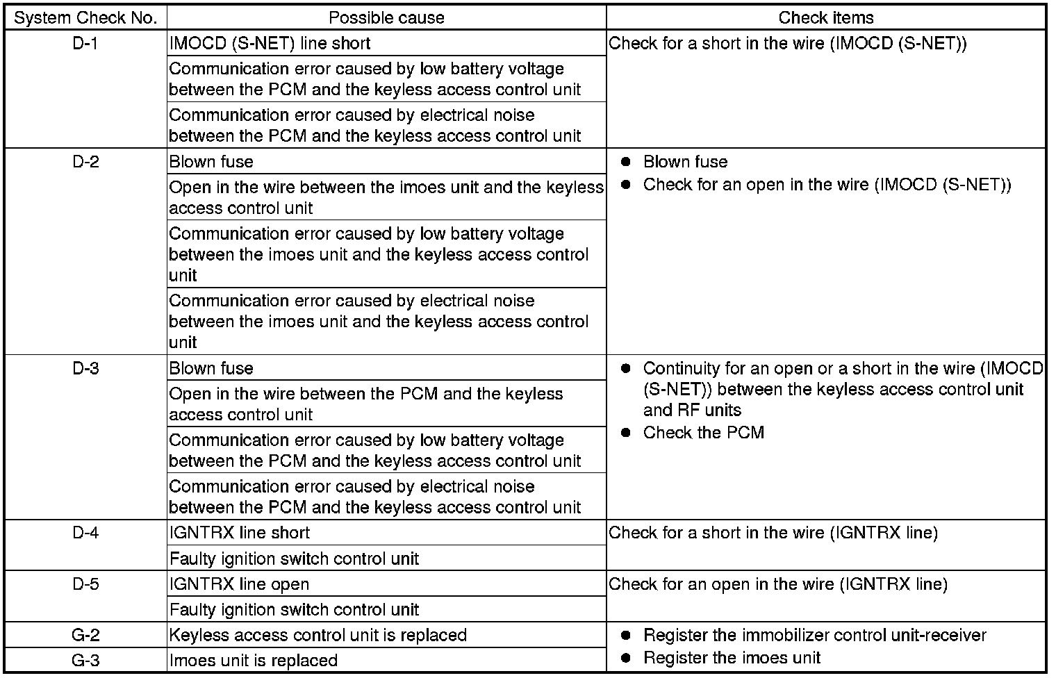 If a malfunction occurs in the immobilizer or keyless access system circuit power supply and ground lines, identify the lines to check with this table: