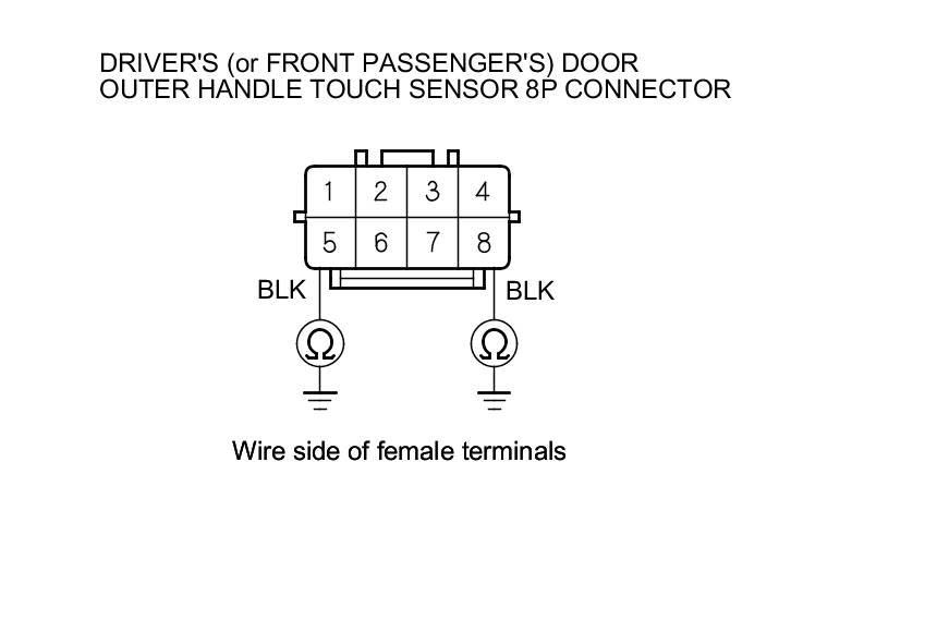 13. Connect driver's (or front passenger's)* door outer handle touch sensor 8P connector terminals No. 2 and No. 6 to body ground with jumper wires.