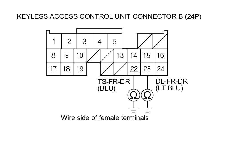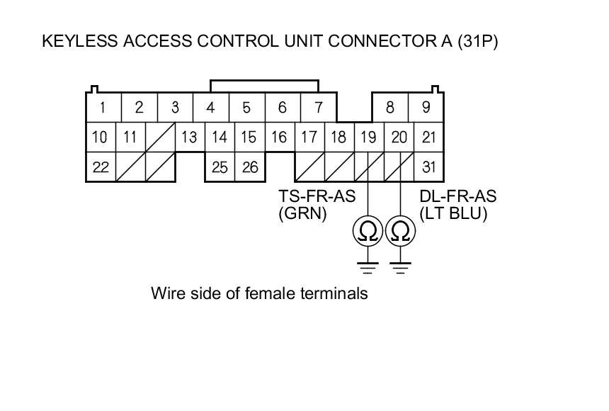 16. Check for continuity between keyless access control unit connector A (31P) terminals No. 19 and No. 20 and body ground (for front passenger's door touch sensor), or between keyless access control unit connector B (24P) terminals No. 22 and No. 23 and body ground (for driver's door touch sensor).