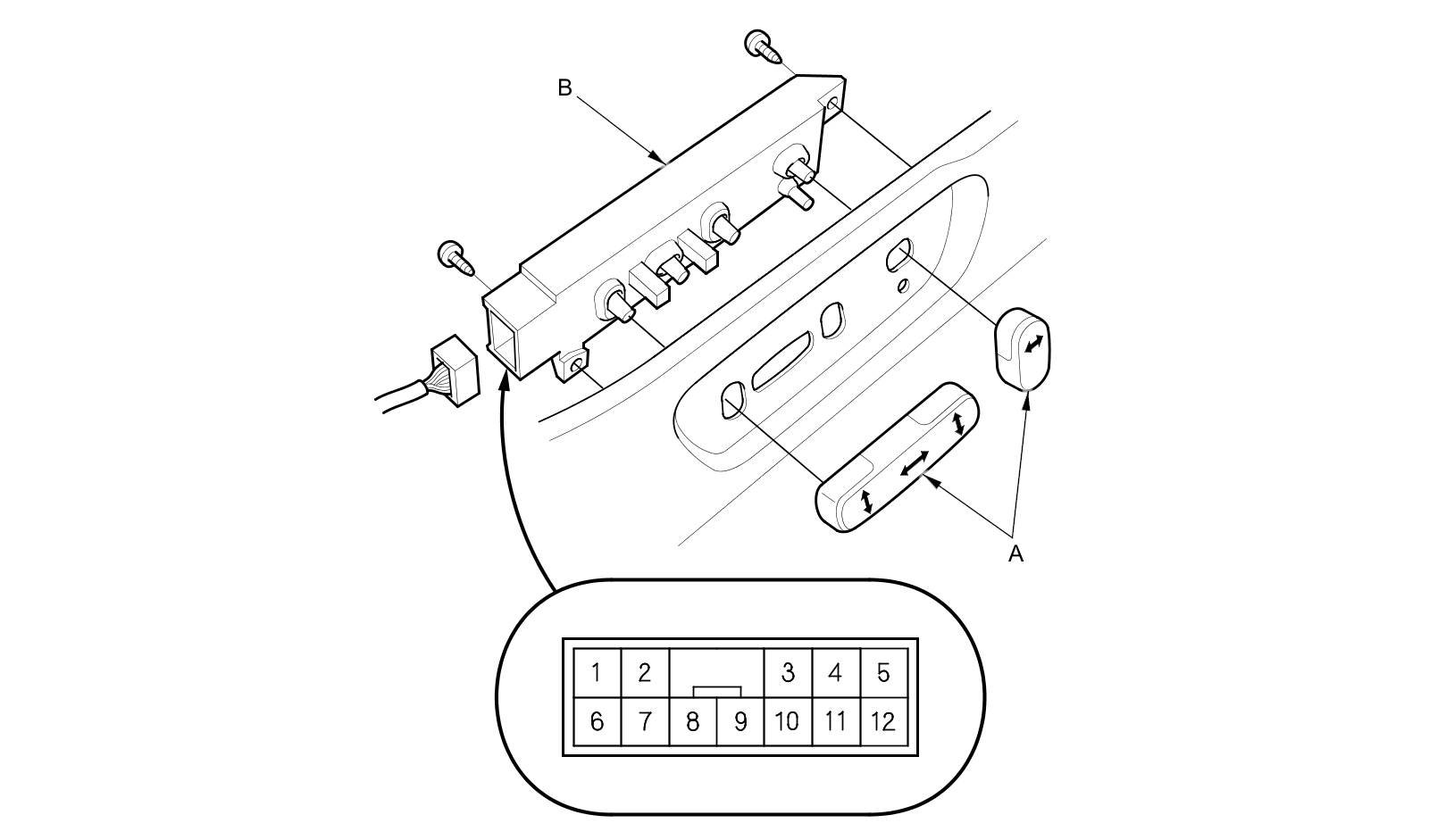 1. Remove the power seat adjustment switch knobs (A) and recline cover from the driver's power seat Front Seat Cushion Cover Replacement, then remove the two screws and the power seat adjustment switch (B).