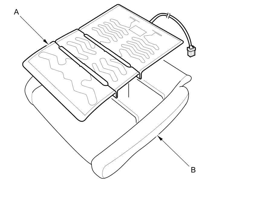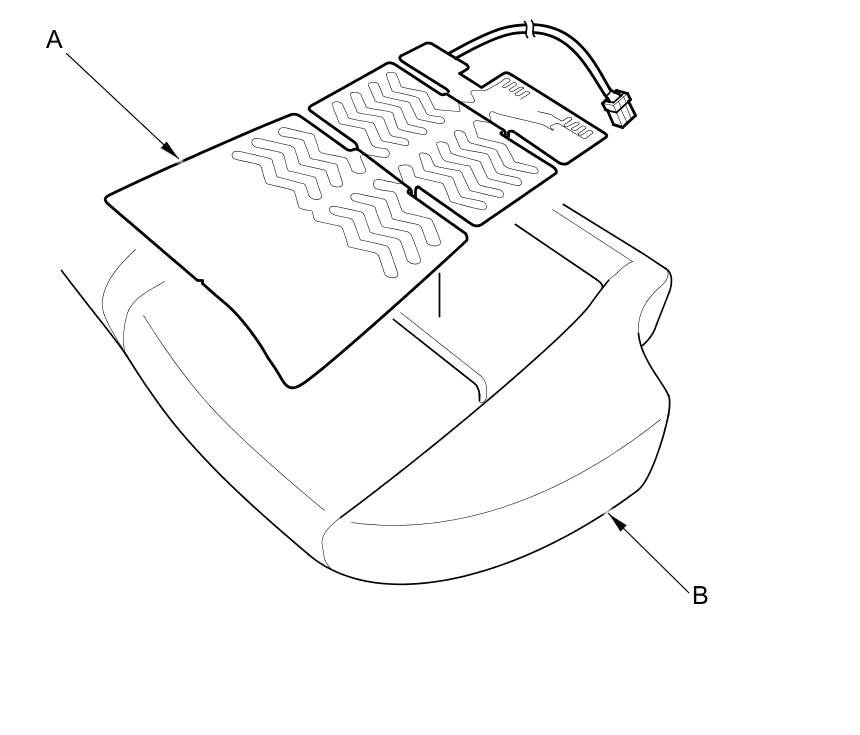 2. Carefully remove the seat cushion heater (A) from the seat cushion pad (B).
