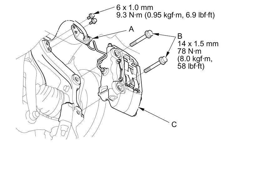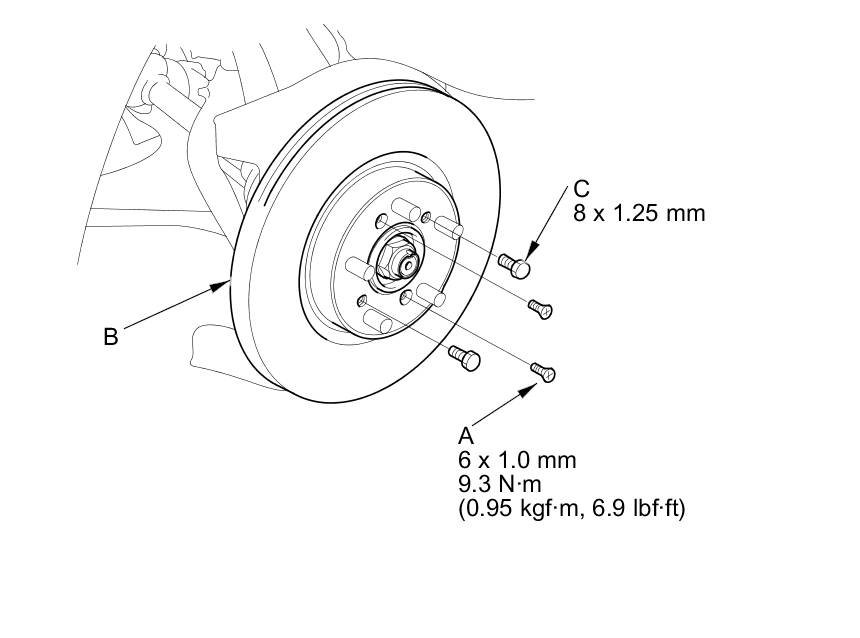 NOTE: If the brake disc is stuck to the front hub bearing unit, thread two 8 x 1.25 mm bolts (C) into the brake disc to push it away from the hub bearing unit. Turn each bolt 90 degrees to prevent the brake disc from binding.